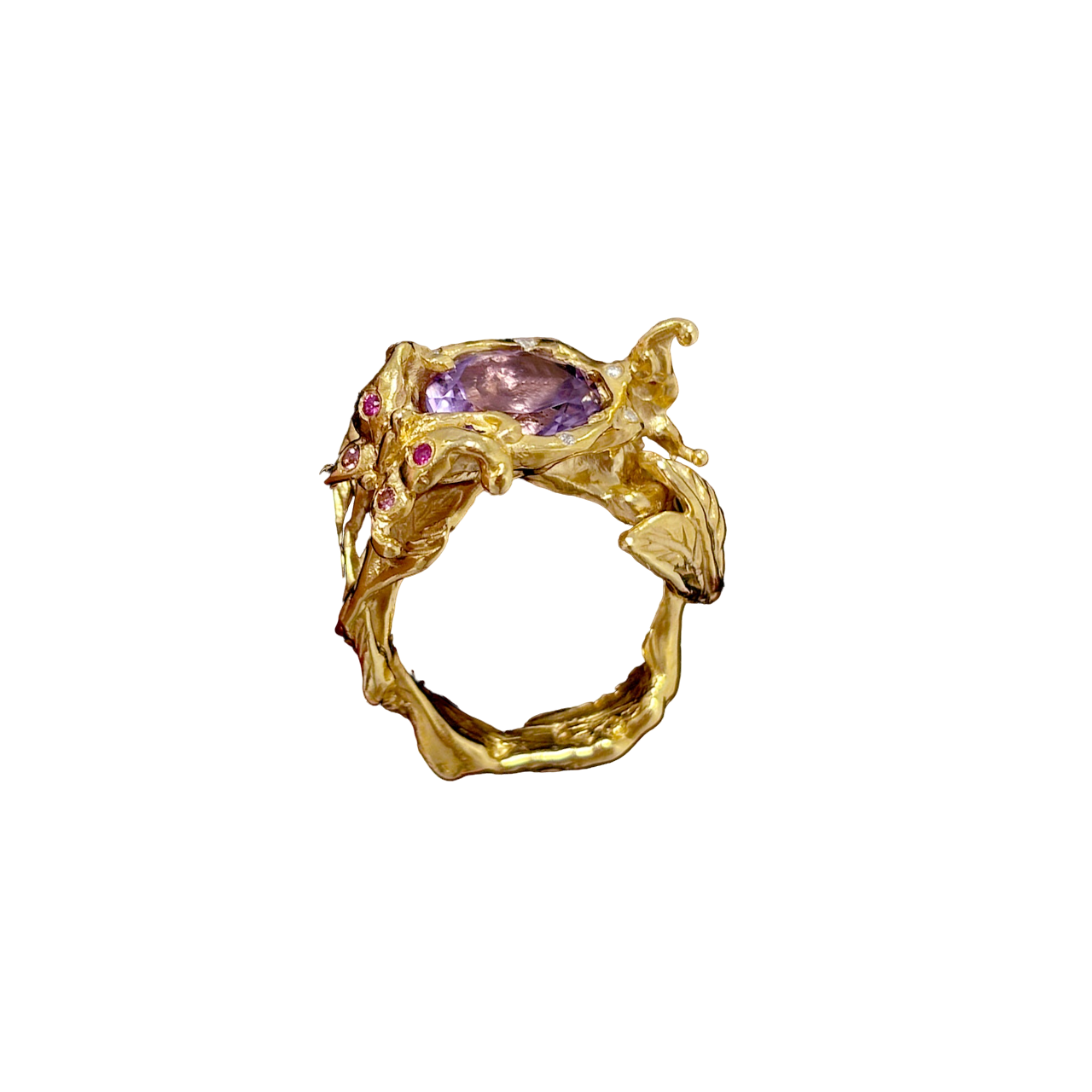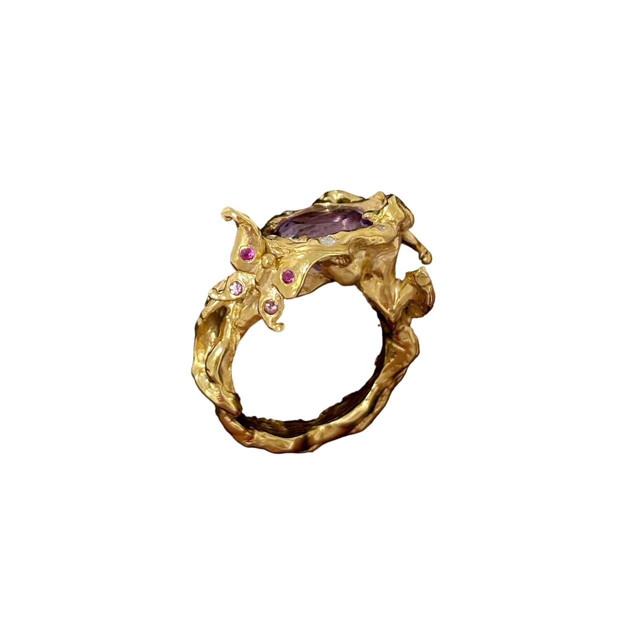 An 18 karat gold ring framed with winding vines and butterflies, set with diamonds, pink tourmalines and amethyst. This ring can be resized according to custom request.