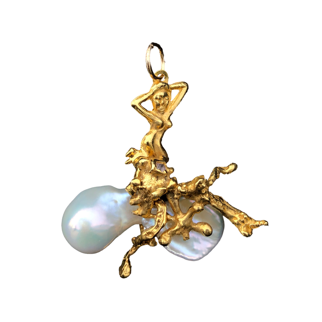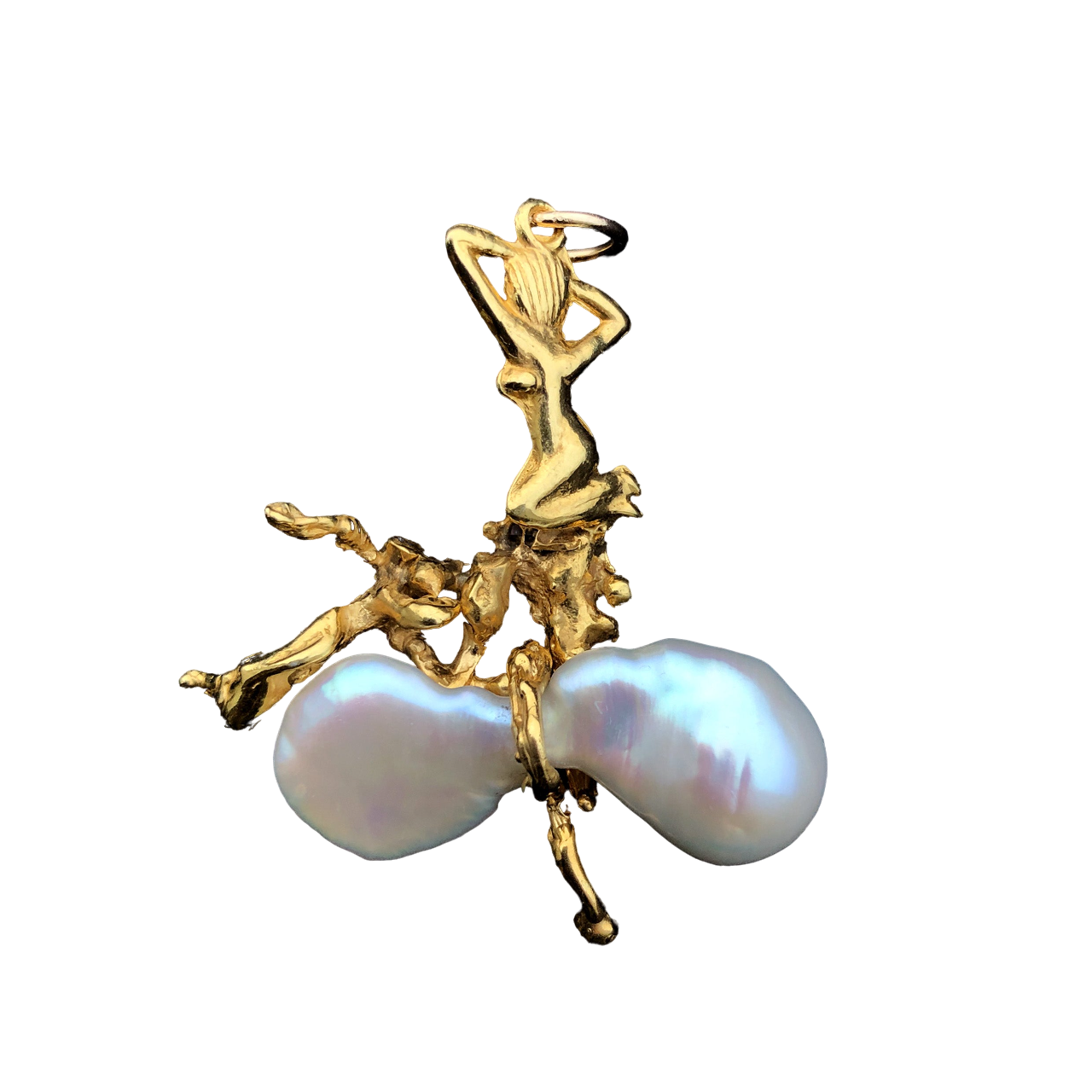 An 18 karat gold-plated carved pendant cradling a baroque pearl. A pale pink sapphire sits at the feet of the figure on top of this piece. Pearls symbolize loyalty and strength, while pink sapphires are purported for their ability to rebalance blockages in love and compassion. This pendant measures 50mm x 40mm and comes without a chain.